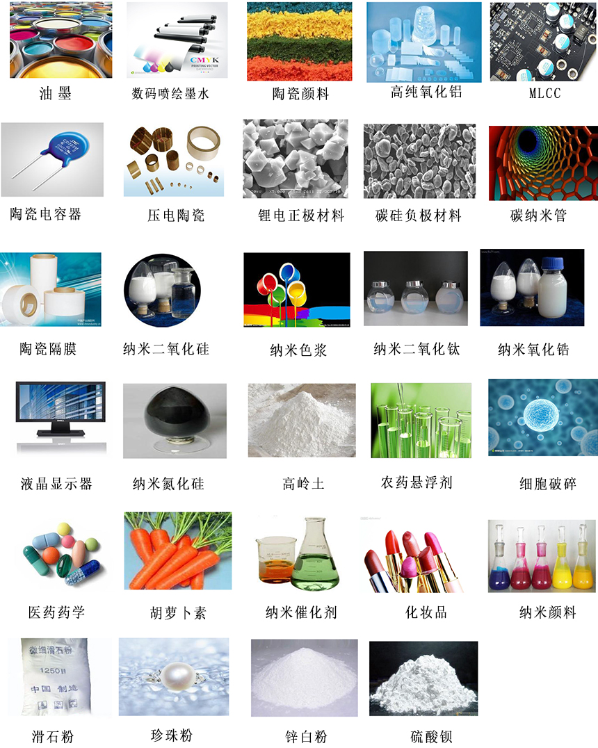 陶瓷材料、电池材料、数码喷墨、高性能涂料、制药等领域的研究与测试。